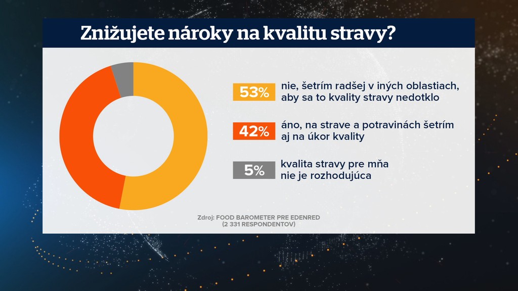 Ste pre rastúce ceny nútený znižovať svoje nároky na kvalitu stravy? Pýtal sa vyše dvoch tisícok ľudí prieskum pre spoločnosť Edenred. Celkovo 42 percent z nich odpovedalo kladne a ďalších päť percent kvalitu jedla vôbec nerieši.