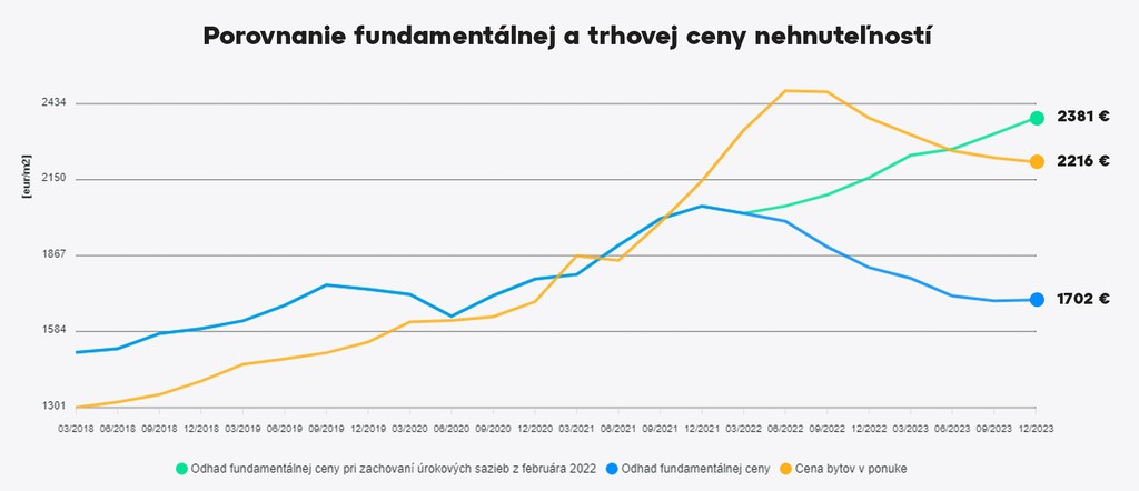 Analytici na základe komplikovaného vzorca totiž vypočítali, že cena jedného štvorcového metra by mala byť len 1702 eur. Rozdiel teda medzi trhovou a fundamentálnou hodnotou, ktorú uvádza NBS, je až 514 eur.