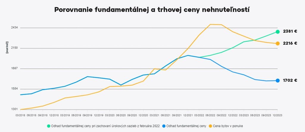 Analytici na základe komplikovaného vzorca totiž vypočítali, že cena jedného štvorcového metra by mala byť len 1702 eur. Rozdiel teda medzi trhovou a fundamentálnou hodnotou, ktorú uvádza NBS, je až 514 eur.