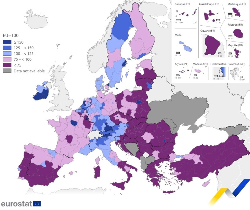 EÚ má novú mapu regiónov. Odborníci v nej označili, ako ktorý región prosperuje. Nadpriemerné označili modrou, podpriemerné fialovou.