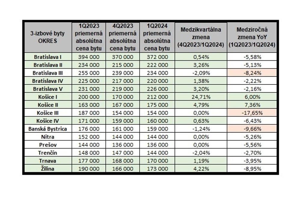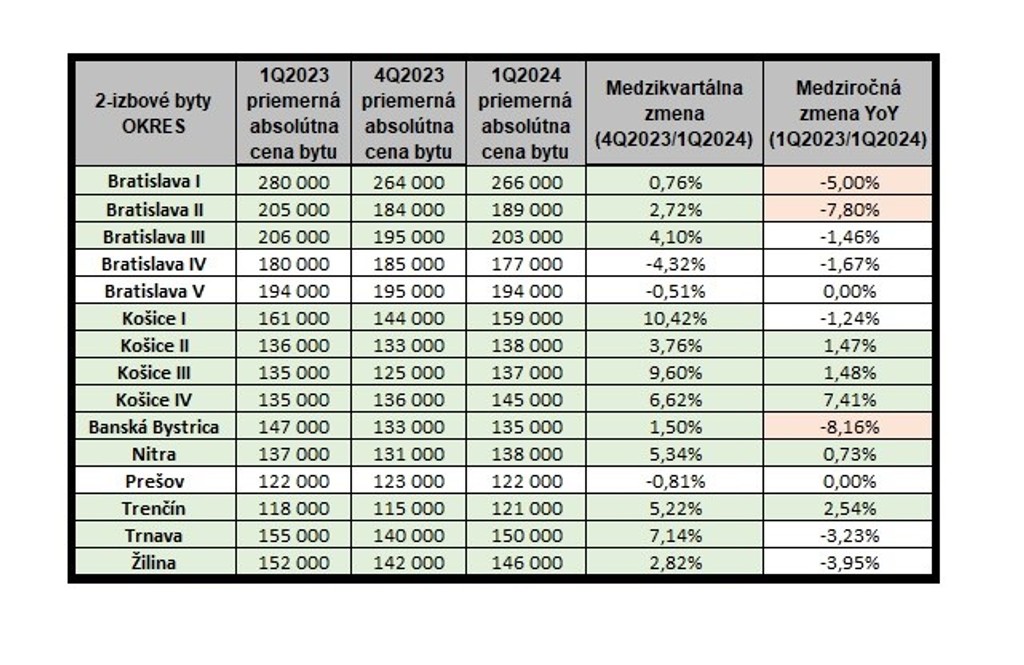 Za prvý štvrťrok najviac stúpli ceny menších bytov v Košiciach (3,76 % - 10,42 %), Trnave (7,14 %), Nitre (5,34 %) a Trenčíne (5,22 %). Najvyšší medziročný rast zaznamenali Košice IV (7,41 %), ale mierne vzrástli aj v Trenčíne a Košiciach II a III.