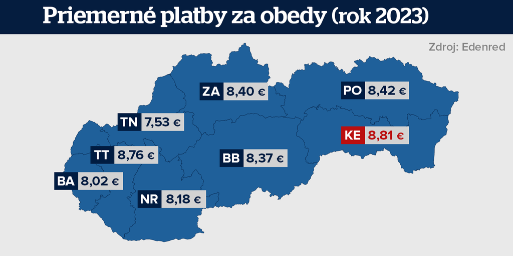 Pozrite si priemerné útraty za obedy v regiónoch Slovenska za tento rok podľa dát spoločnosti Edenred. Najdrahšie nie je hlavné mesto, ako by si mnohí mysleli, ale susedný Trnavský kraj.