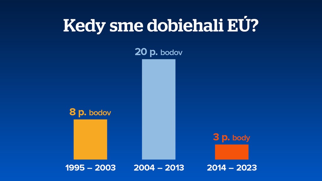 V roku 1995 naša ekonomika dosahovala len 58 percent priemeru tej európskej. Vlani to bolo 80 percent. Česko za rovnaký čas zvýšilo hospodársky výkon zo 79-tich na 90 percent európskeho priemeru.