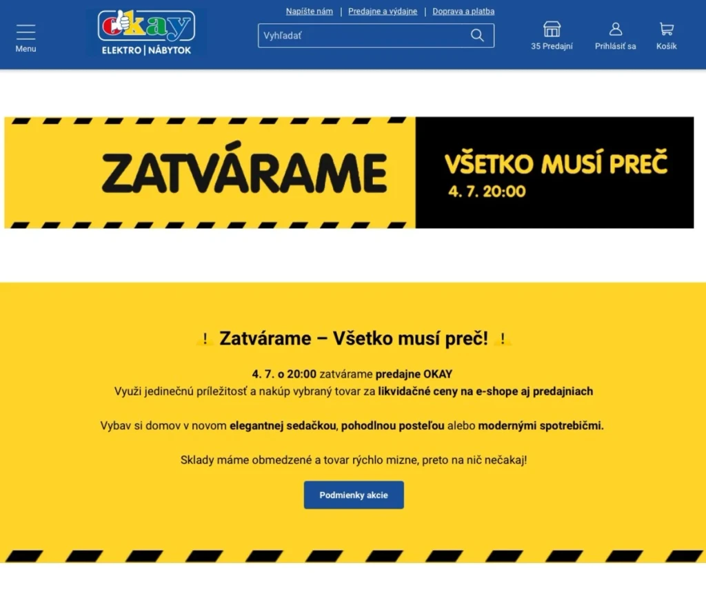 Známy reťazec s elektronikou Okay spustil koncom júna veľkú marketingovú kampaň, ktorá evokovala jeho zánik. Na svojej stránke aj sociálnych sieťach totiž uvádzal, že všetky predajne 4. júla o 20.00 h zatvorí a všetok tovar musí ísť preč.