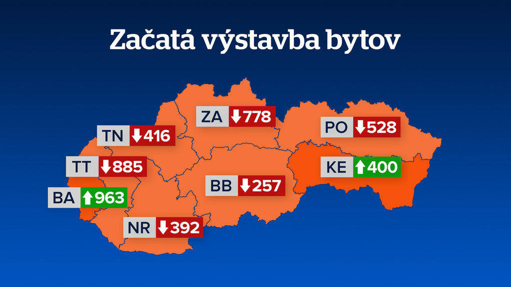 Pri pohľade do regiónov počty začatých bytov v rodinných či bytových domoch medziročne klesli v šiestich z ôsmich krajov.