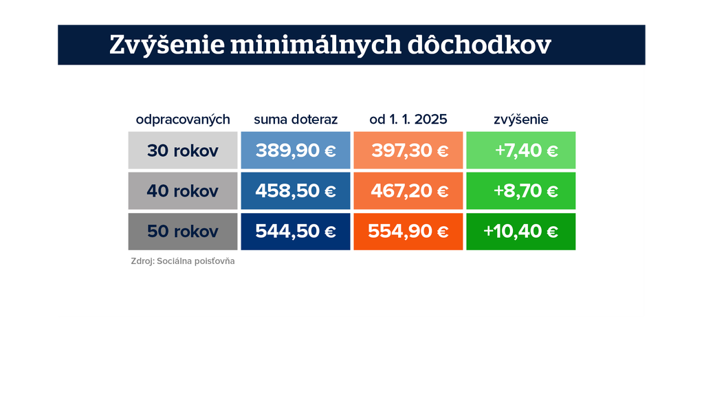 „Minimálny dôchodok je naviazaný na životné minimum. Suma minimálneho dôchodku po 40 odrobených rokoch narastie na 467,20,“ vysvetľuje hovorca Sociálnej poisťovne Martin Kontúr.