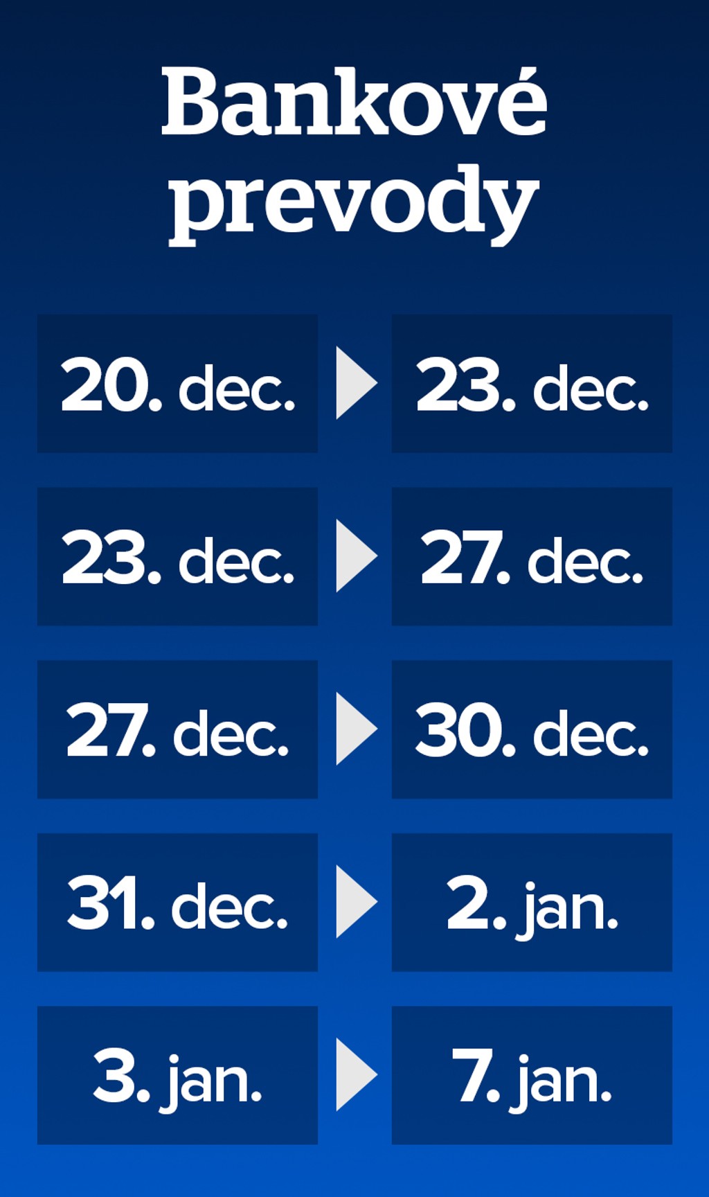 Keď pošlete peniaze do inej banky najbližší piatok (20. 12.), príjemcu si nájdu až v pondelok (23. 12.).
