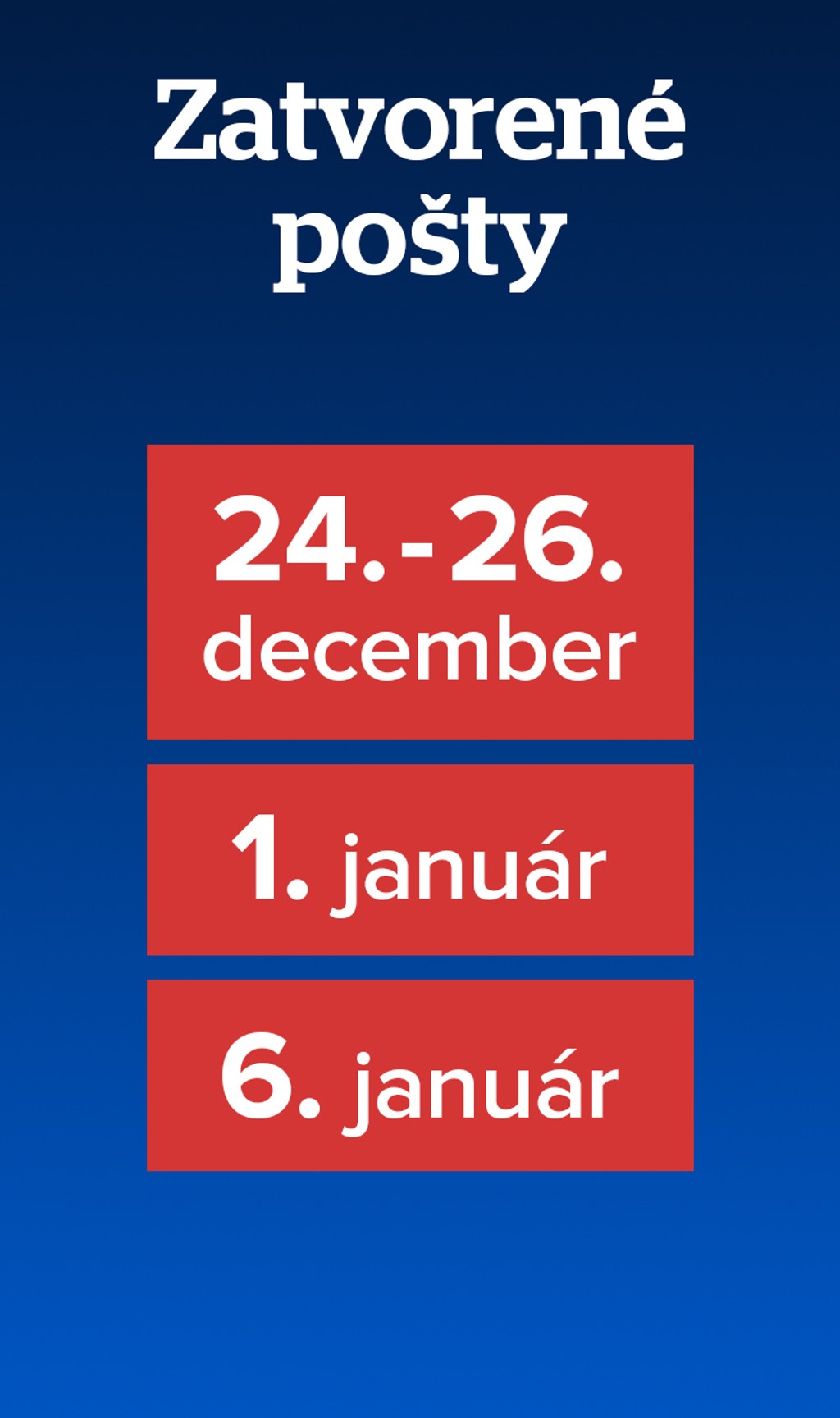 Pozor si treba dávať aj na otváracie hodiny pôšt. Zatvorené budú od 24. do 26. decembra a potom aj 1. a 6. januára.