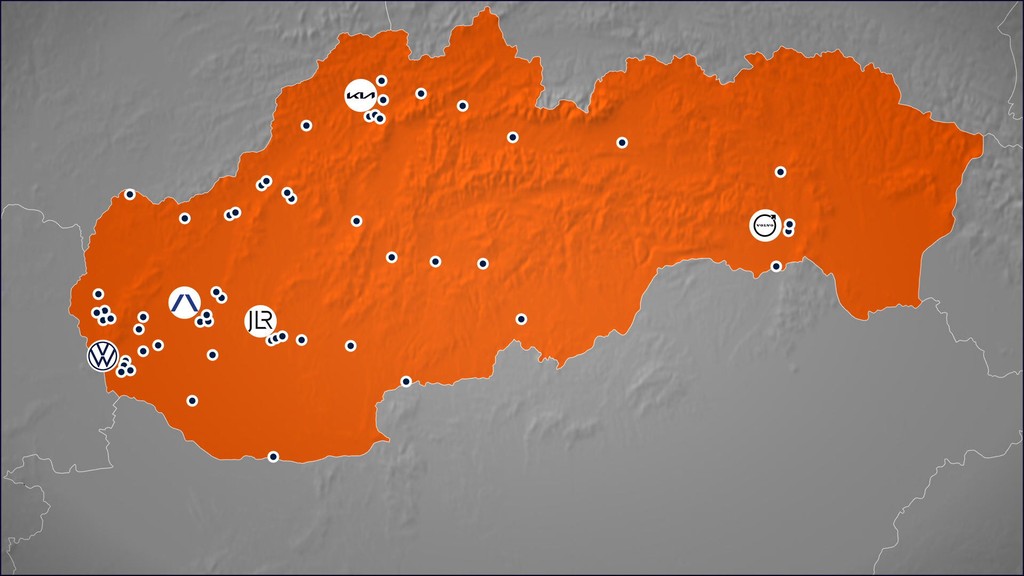 Na mape môžete vidieť, kde sú sústredené najväčšie firmy autopriemyslu. Tam pocítime prvý dôsledok amerických ciel, ak ich Donald Trump zvýši aj voči európskemu dovozu.