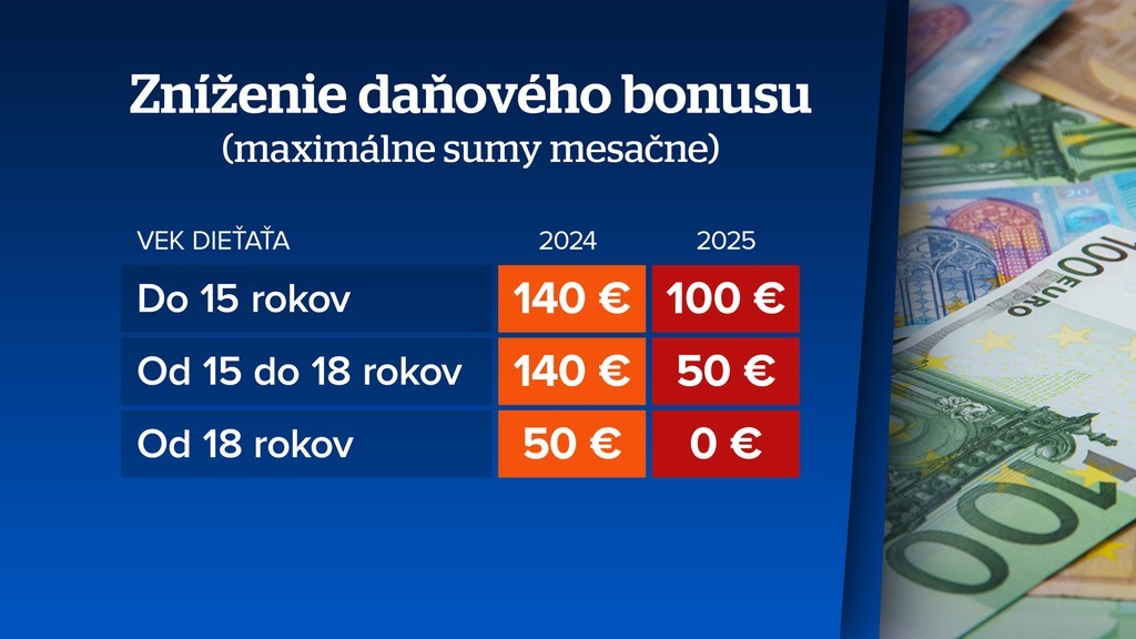 Ak máte menšie dieťa do 15 rokov, namiesto doterajších 140 eur mesačne si budete môcť odrátať z daní najviac stovku. Pri starších deťoch iba 50 eur. No a na plnoletých študentov už po novom nedostanete vôbec nič.