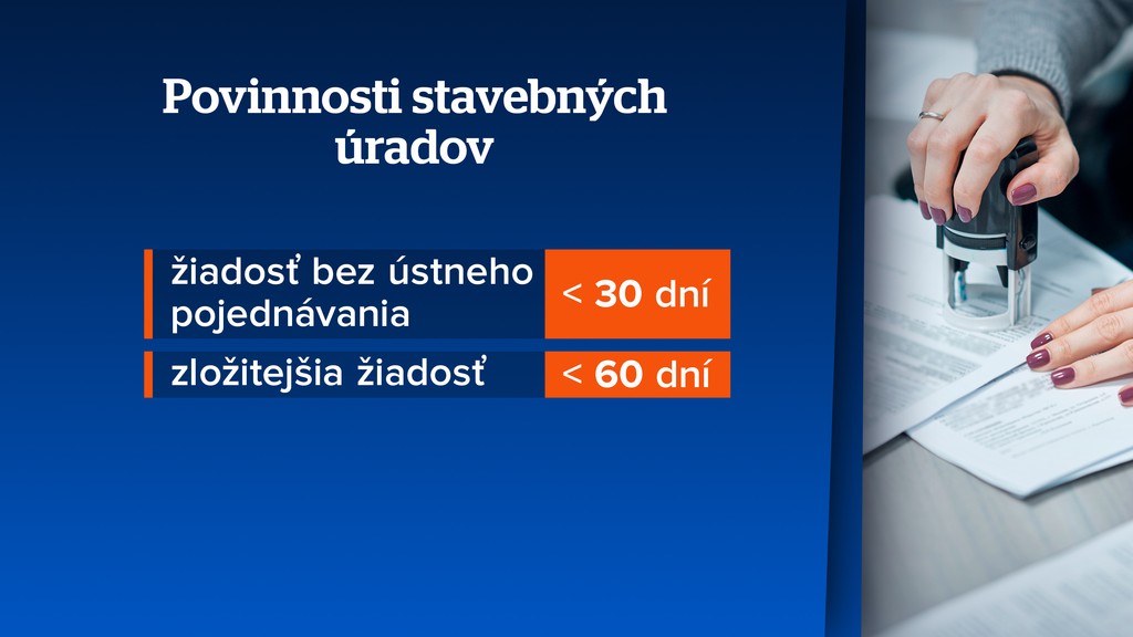 Pre stavebné úrady sa stanovujú jasné lehoty – vo veciach, o ktorých je možné rozhodnúť na základe žiadosti bez ústneho pojednávania alebo miestnej obhliadky 30 dní, v ostatných prípadoch najviac 60 dní.