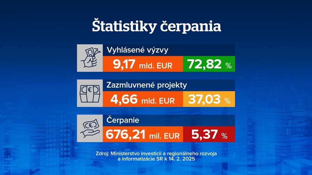 Slovensku sa v aktuálnom období zatiaľ podarilo vypísať výzvy v objeme viac ako deväť miliárd, čo predstavuje vyše 70 percent z 13-miliardového koláča. Jedna vec je však ponúknuť peniaze, druhá vymyslieť ich zmysluplné míňanie. Tu sa nám už darí menej, zazmluvnených je 37 percent projektov. Čerpanie, teda vyplácanie peňazí, je na úrovni piatich percent.