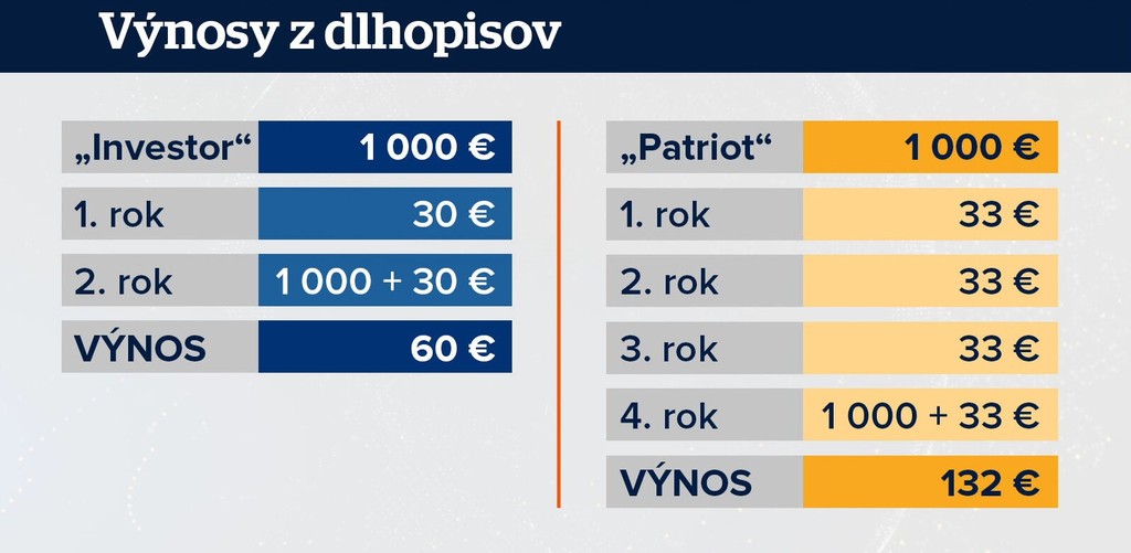 Kto dnes však za 1000 eur kúpi štvorročný dlhopis s označením Patriot, každý rok jeho vlastnenia mu štát pošle výnos 33 eur, v roku 2029 mu štát vráti aj pôvodnú investíciu.