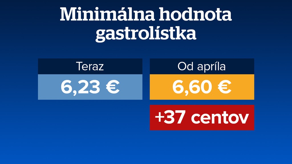 Po novom by ste mali od firmy dostať gastrolístky v hodnote 6,60 eura, čo je o necelých 40 centov viac ako doteraz. Dobrovoľne vám zamestnávateľ môže dať aj viac. Postupne takých síce pomaly, ale isto pribúda.