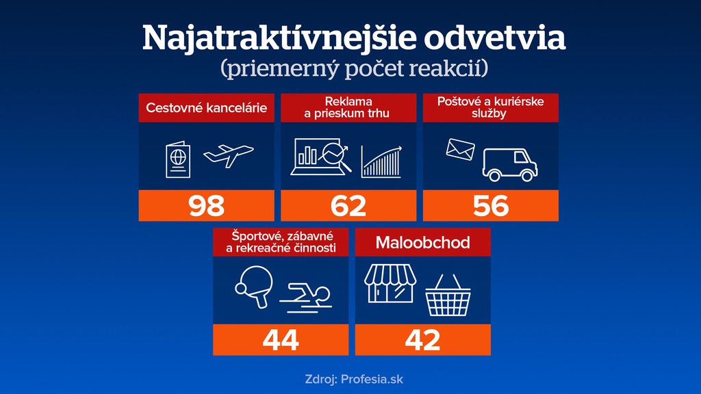 Najväčší záujem je aktuálne v cestovných kanceláriách, ktoré majú na pracovnú ponuku v priemere takmer stovku reakcií. V kurze je však aj práca v reklame, u kuriérov či v spomínanom maloobchode.