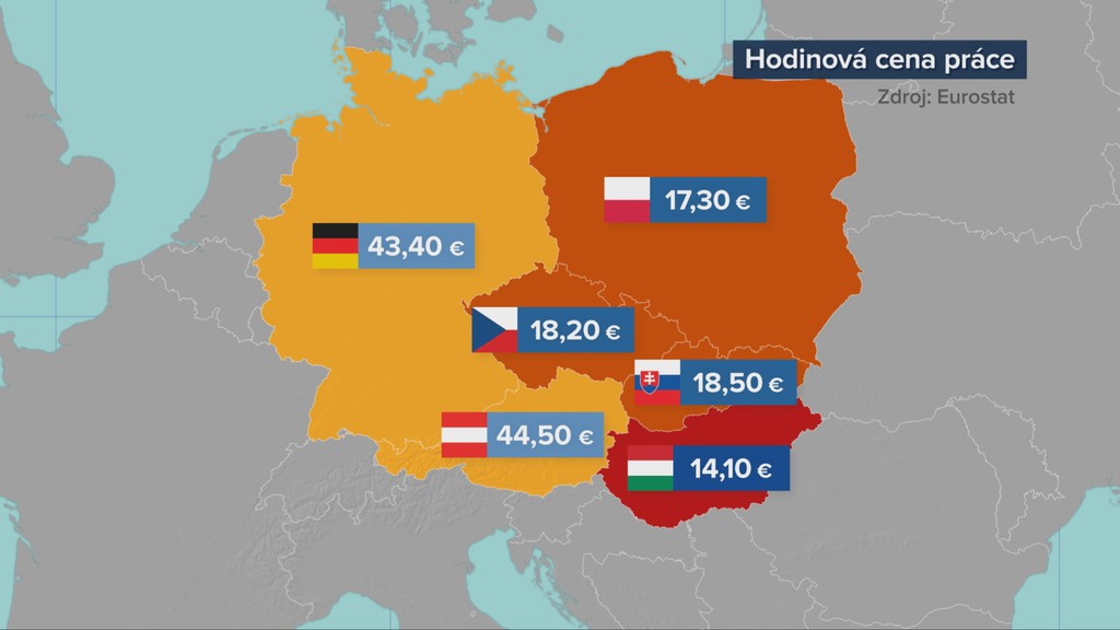 Hodinová cena práce, ktorá okrem zmluvného platu zahŕňa aj odvody a príplatky za nočné či za sviatky, na Slovensku vlani prekročila 18 eur. Je podobná ako v Česku a v Poľsku a oveľa nižšia ako v Nemecku a v Rakúsku.