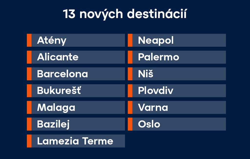 Od polovice novembra a decembra sa cestujúci dostanú aj do miest ako Atény, Lamezia Terme, Neapol, Palermo, Niš, Plovdiv a Varna.