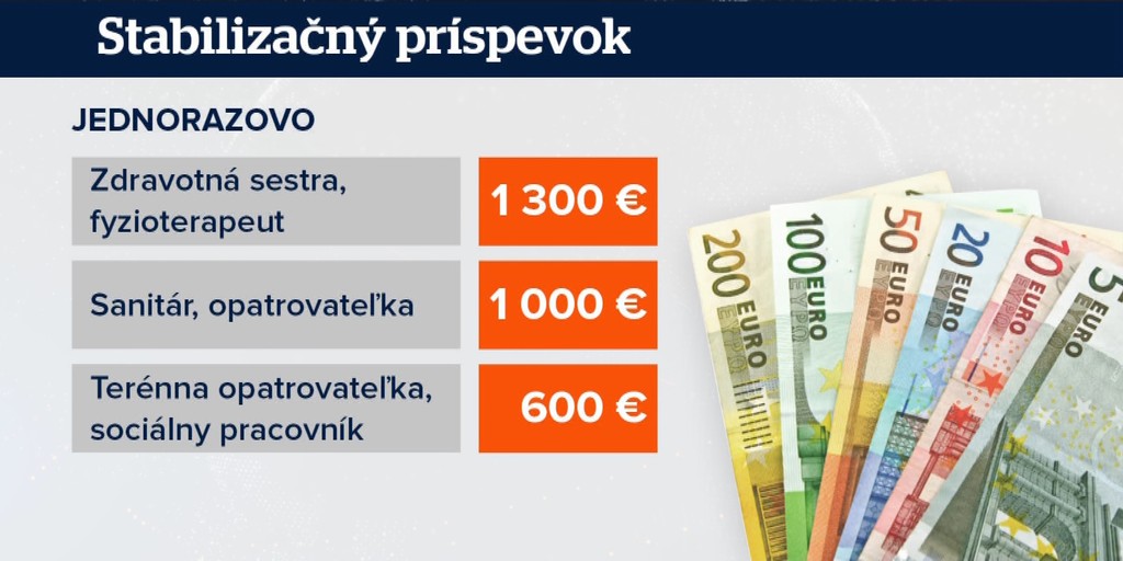 Od 600 eur pre terénnych pracovníkov, tisícku pre opatrovateľov až po 1300 eur pre zdravotné sestry či fyzioterapeutov. Suma je v hrubom, po očistení o dane dostanú na ruku menej.