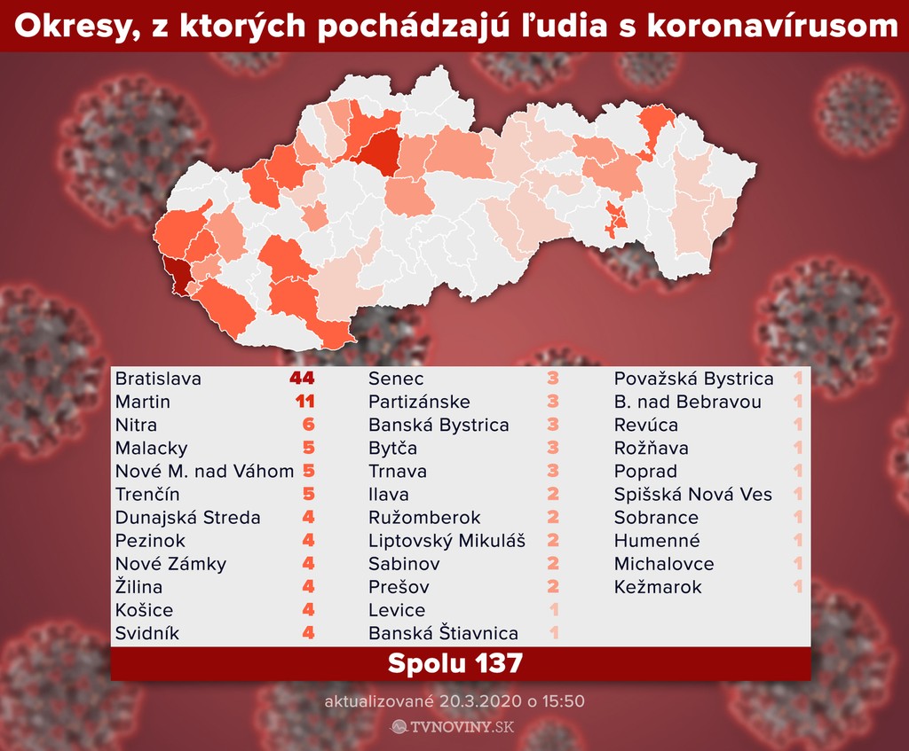 Ministerstvo zdravotníctva v piatok informovalo, že počet ľudí s potvrdeným koronavírusom znovu narástol. Pribudlo 14 Slovákov s ochorením COVID-19, ich celkový počet sa tak u nás zvýšil na 137.