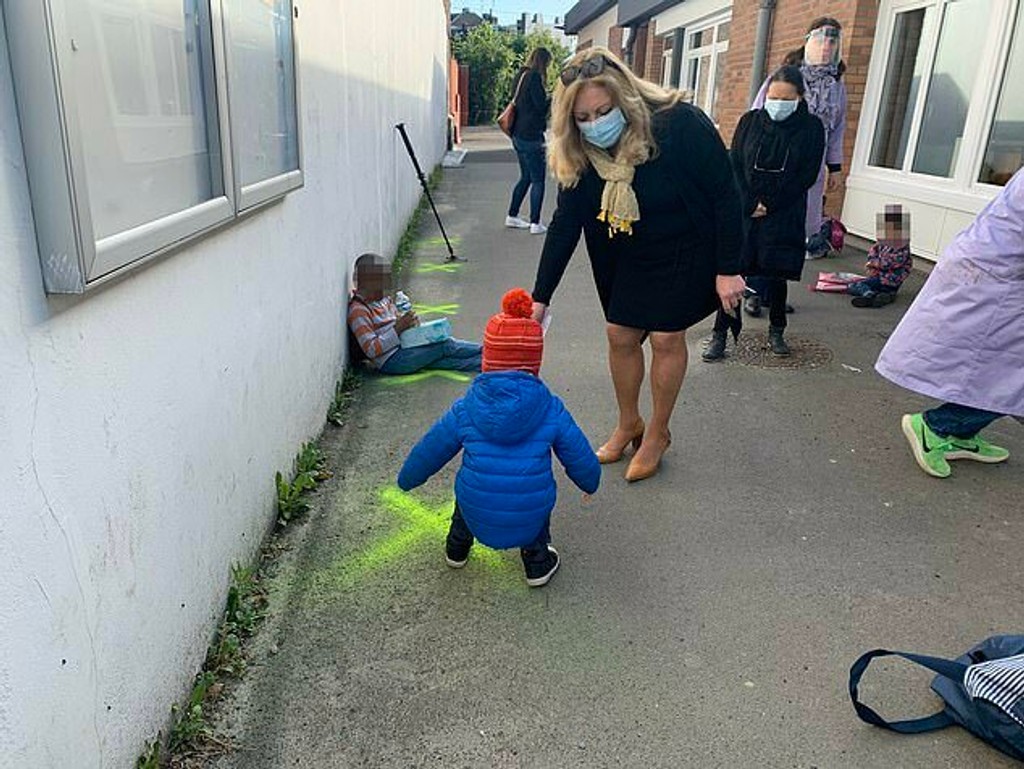 Deti musia zostať vo svojich „zónach". Na ďalších fotografiách majú deti na zemi nasprejované krížiky, aby vedeli, ako ďaleko majú od seba stáť. Dodržiavanie vzdialenosti platí aj v triedach, kde sedí v laviciach iba pár žiakov. Niektoré deti majú celý deň na tvári aj rúško.