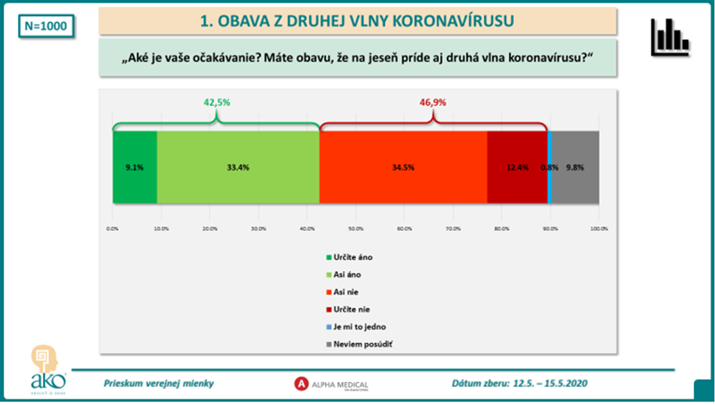 Podľa prieskumu agentúry AKO pre sieť súkromných laboratórií Alpha medical až 46,9 percenta ľudí sa nebojí druhej vlny nákazy. Naopak, na jeseň ju očakáva 42,5 percenta opýtaných. Najväčšie obavy majú ľudia vo veku od 50 do 65 rokov. Spomedzi krajov, sa ľudia najviac boja v Nitrianskom, Bratislavskom a Prešovskom. Teda, v tých regiónoch, kde bolo nakazených najviac ľudí.