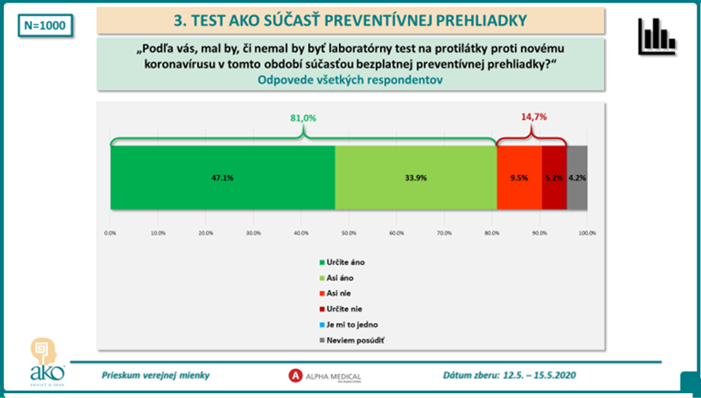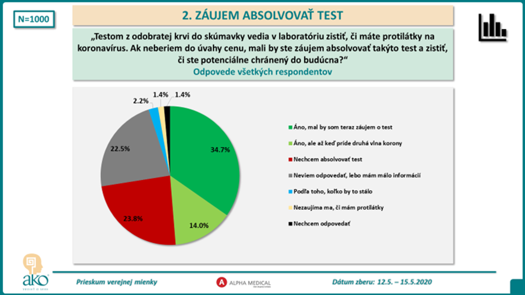 Agentúra zisťovala, či majú ľudia záujem o testovanie z krvi na protilátky ochorenia COVID-19. Väčšina tých, ktorí sa druhej vlny boja, by sa dala testovať. Z tých, ktorí si nemyslia, že príde druhá vlna, by sa dala otestovať zhruba tretina opýtaných.