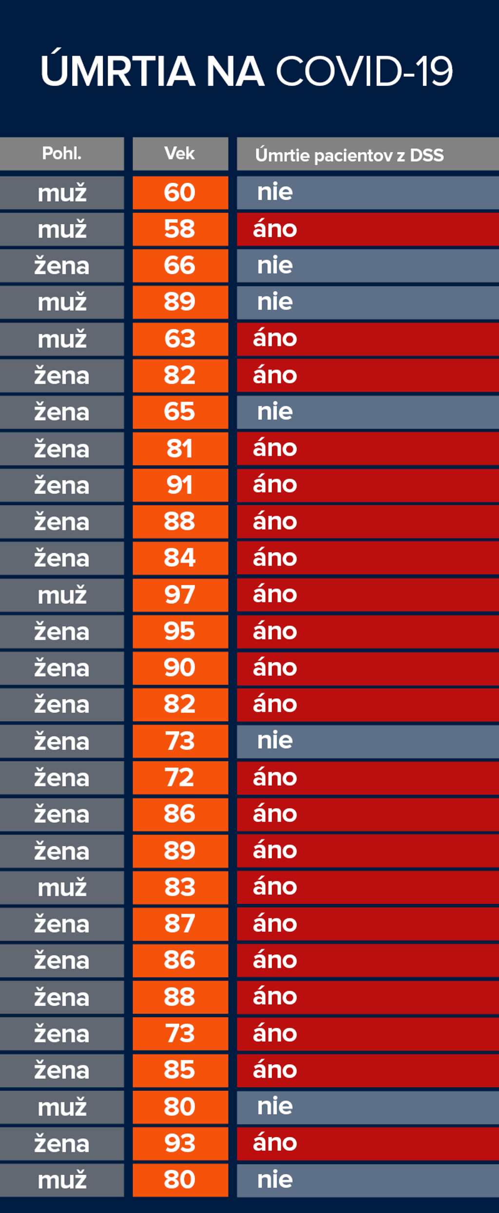 Najmladší pacient, ktorý podľahol ochoreniu COVID-19, mal 58, najstarší 97 rokov. Oboch spája, že boli muži a bývali v Domove sociálnych služieb. Na druhej strane, najmladšia žena mala 65, najstaršia zasa 95 rokov.