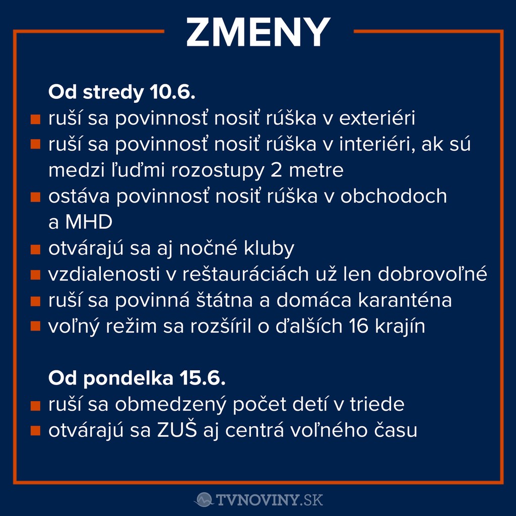 Rúška už vo vnútri nie sú povinné, ak ľudia dodržiavajú dvojmetrové rozostupy. Rúška už nemusíme nosiť ani na ulici. V obchodoch a v mestskej hromadnej doprave ostávajú rúška povinné.