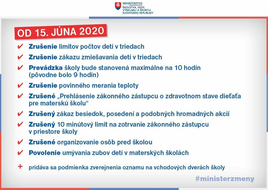 Od pondelka (15. 6.) sa zrušia počty žiakov v materských školách i žiakov v 1. až 5. ročníkov základných škôl. Od tohto dňa bude prevádzka škôl stanovená na desať hodín, doteraz to bolo deväť. "Ruší sa povinné meranie teploty, po novom je to formou odporúčania a bude náhodné," povedal minister školstva.