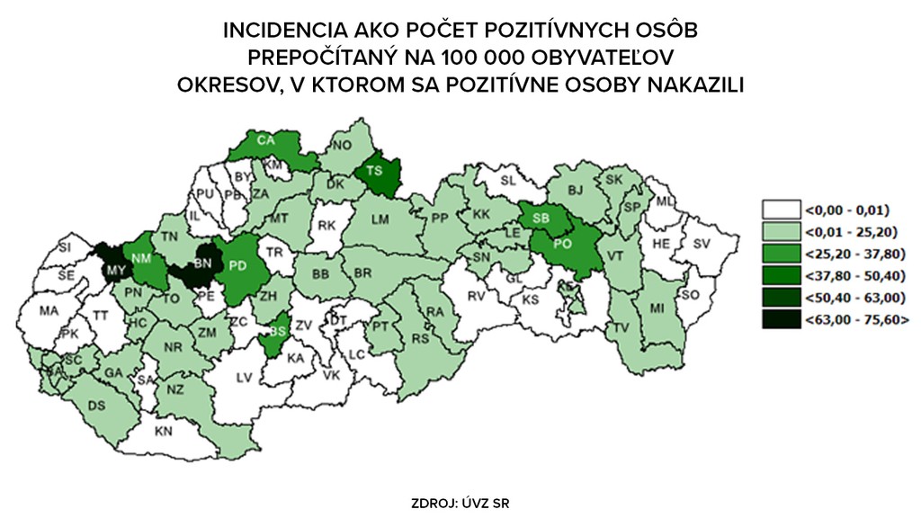 Zaujímavý je aj pohľad na jednotlivé regióny. Z dát totiž vyplýva, že v 12 okresoch sa COVID-19 vôbec nenachádza (biela farba), na druhej strane je najhoršia situácia v okrese Myjava a Bánovce nad Bebravou (čierna farba). Konkrétnymi prípadmi z týchto lokalít sme sa venovali TU a TU.