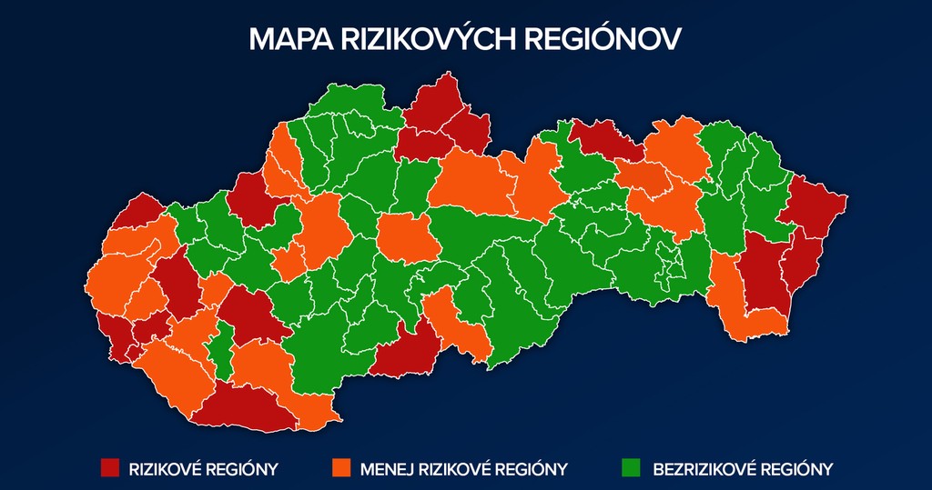 Menej rizikové regióny: Banská Bystrica, Bardejov, Dunajská Streda, Galanta, Hlohovec, Ilava, Liptovský Mikuláš, Lučenec, Malacky, Nové Zámky, Partizánske, Pezinok, Poprad, Prešov, Prievidza, Púchov, Sabinov, Senica, Trebišov