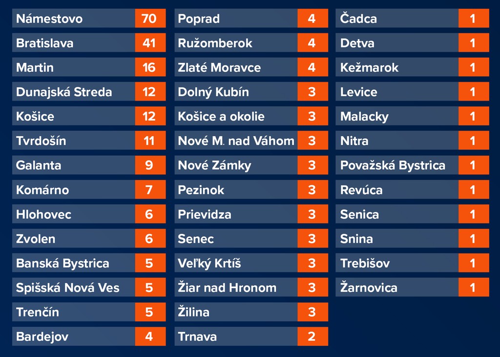 Nasledujú Martin (16), Dunajská Streda (12), Košice (12), Tvrdošín (11), Galanta (9), Komárno (7), Hlohovec (6), Zvolen (6), Banská Bystrica (5), Spišská Nová Ves (5) a Trenčín (5). Štyri prípady boli v okresoch Bardejov, Poprad, Ružomberok a Zlaté Moravce, po tri prípady v okresoch Dolný Kubín, Košice a okolie, Nové Mesto nad Váhom, Nové Zámky, Pezinok, Prievidza, Senec, Veľký Krtíš, Žiar nad Hronom a Žilina. Dva prípady boli v okrese Trnava, jeden prípad zaznamenali Čadca, Detva, Kežmarok, Levice, Malacky, Nitra, Považská Bystrica, Revúca, Senica, Snina, Trebišov a Žarnovica.