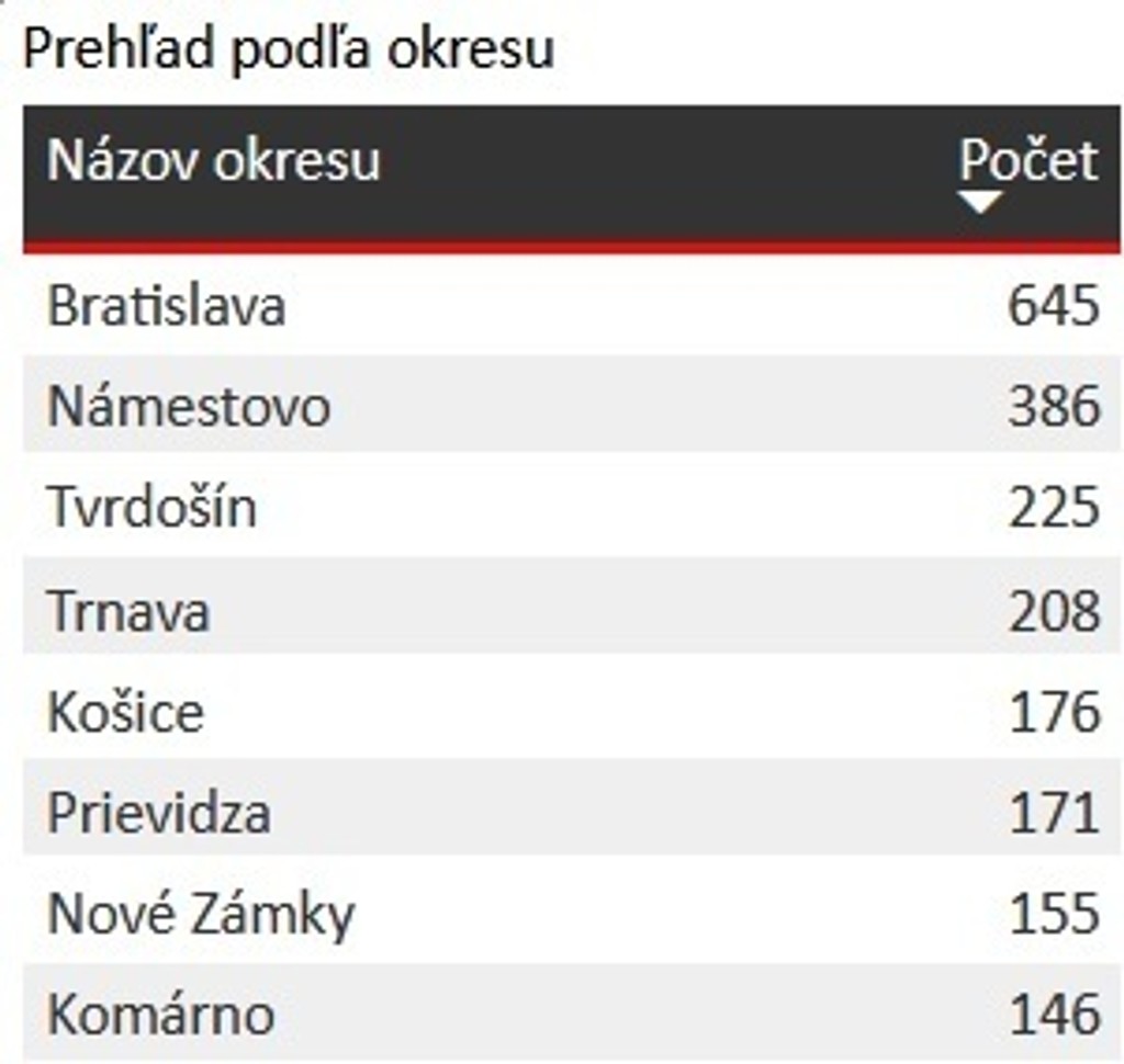 Najviac, 645 prípadov, za uplynulých 14 dní evidujú v Bratislave. Viacero osláv a svadieb na severe Slovenska sa prejavilo aj v číslach za toto obdobie. Námestovo má 386 prípadov za posledné dva týždne, Tvrdošín 225.