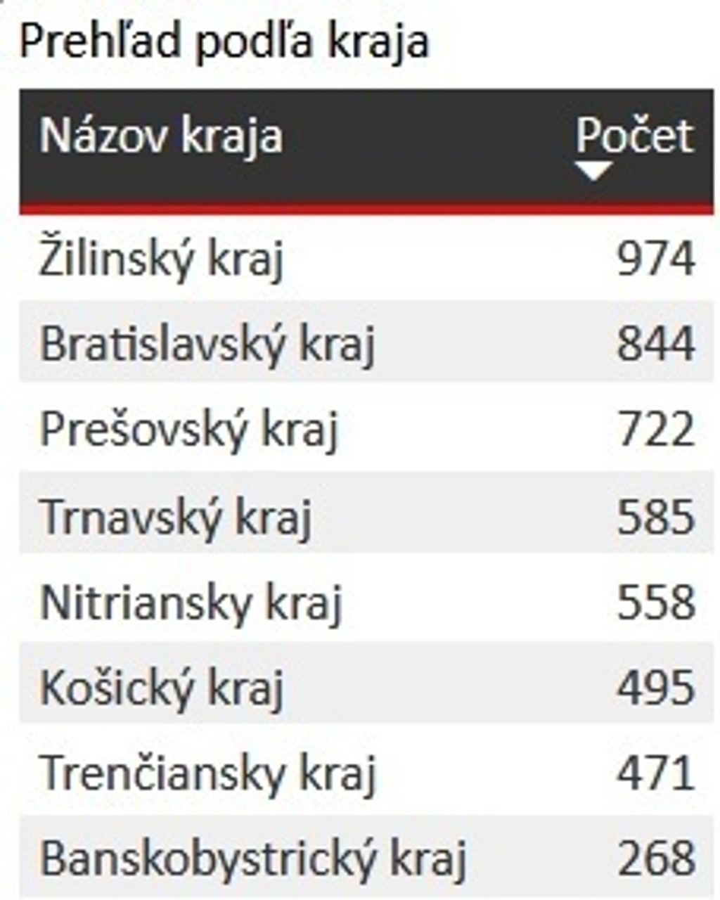 Spomedzi krajov dominuje Žilinský (974), s 844 pozitívnymi testami nasleduje Bratislavský, 722 hlási Prešovský kraj, najmenej (268) má Banskobystrický kraj.