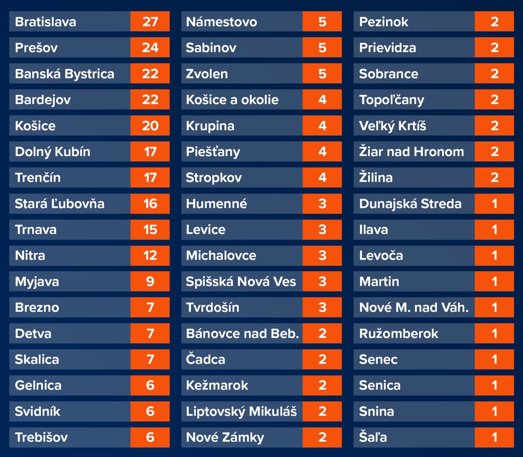Najviac nakazených zaznamenali okresy v Bratislave (27), nasleduje Prešov (24), Banská Bystrica (22), Bardejov (22), Košice (20), Dolný Kubín (17), Trenčín (17), Stará Ľubovňa (16), Trnava (15), Nitra (12), Myjava (9), Brezno (7), Detva (7), Skalica (7), Gelnica (6), Svidník (6) a Trebišov (6).