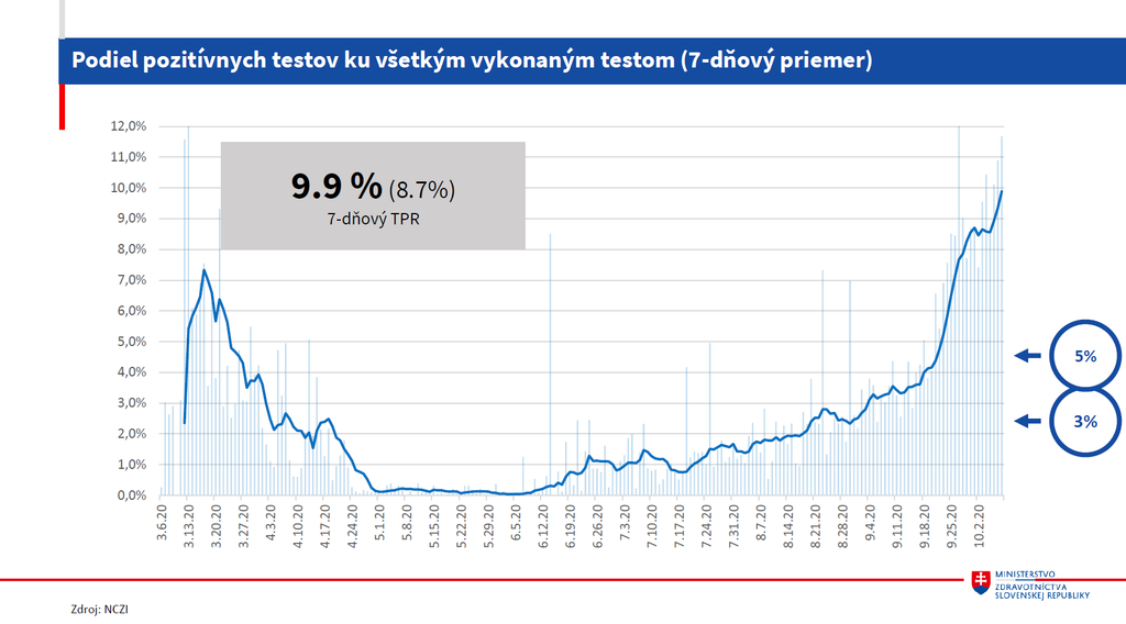 Sedemdňový podiel pozitívnych testov je pre epidemiológov dôležitý údaj. Ukazuje, ako je vírus rozšírený na území, kde sa testuje a tiež, či je počet testov dostatočný. Podľa WHO má krajina epidémiu pod kontrolou, ak je jej 7-dňový podiel pozitívnych testov do 5 percent. Na Slovensku je aktuálne už nad 10 percent, no v niektorých okresoch na hornej Orave dosahuje aj 50 percent.