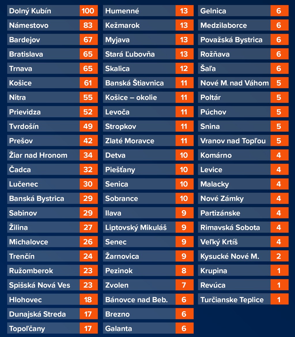 Najviac pozitívnych prípadov zaznamenali v Žilinskom kraji (367), nasleduje Prešovský kraj (264), Košický (179), Banskobystrický (151), Trnavský (138), Trenčiansky (124), Nitriansky (101) a Bratislavský kraj (86). V rámci okresov hlási najviac pacientov Dolný Kubín, kde evidujú 100 infikovaných.