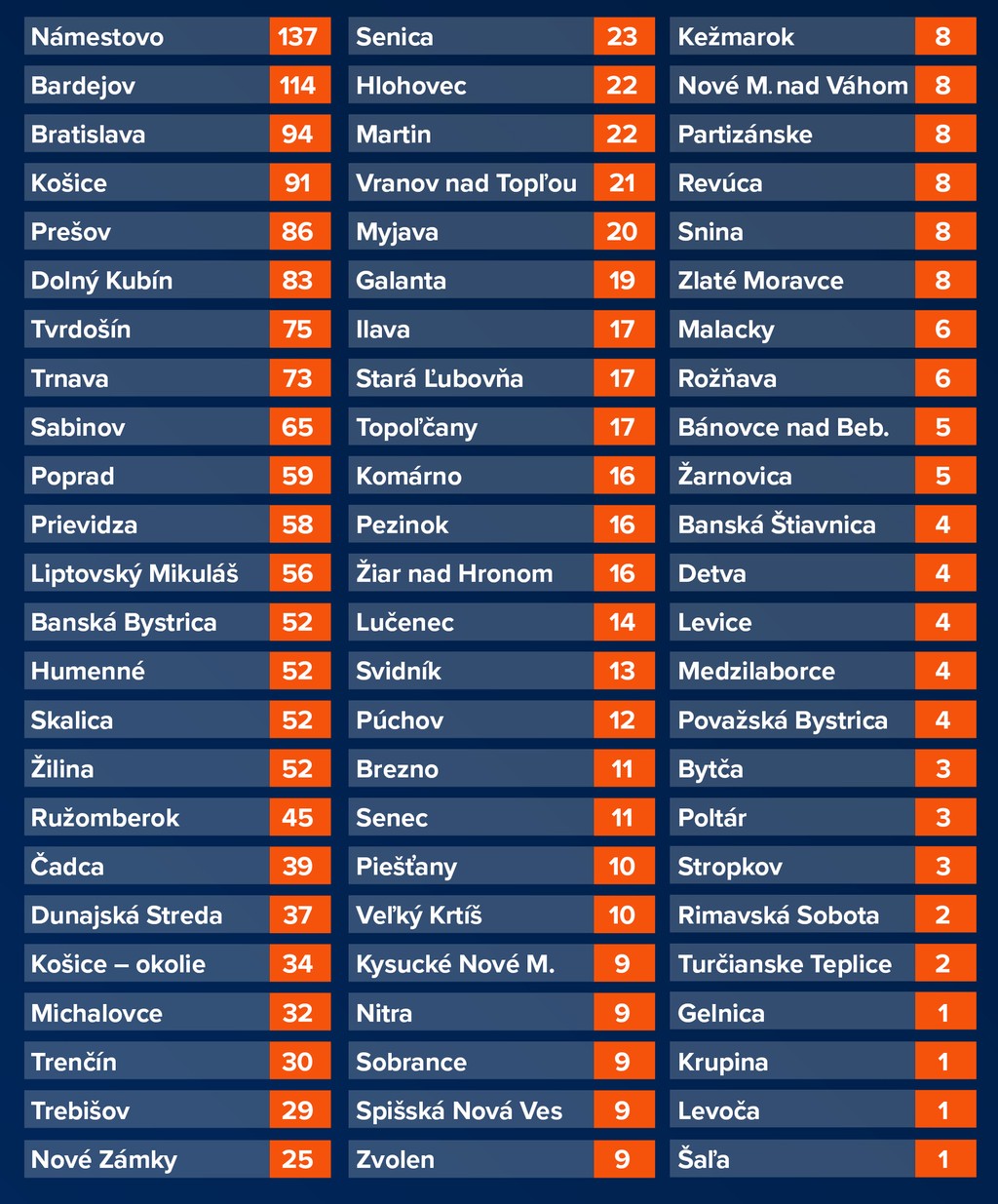 Počet nových prípadov v jednotlivých okresoch nájdete v tabuľke: