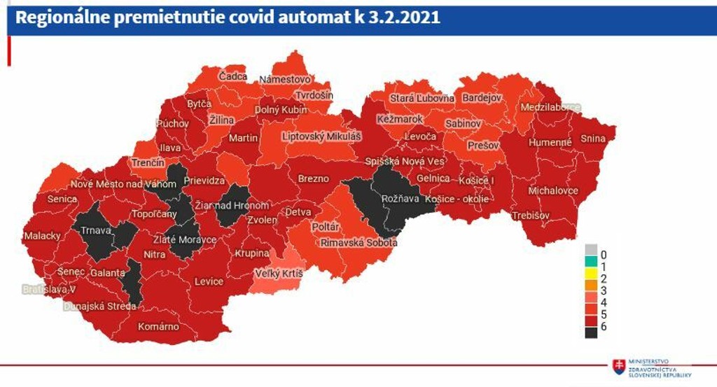 Slovensko sa podľa ministra nachádza stále v čiernej farbe, kde platia najprísnejšie opatrenia. Za veľmi vážnu označuje aj situáciu v regiónoch. „Máme viac červených regiónov, prevahou sú bordové regióny. Potom sú tmavočervené regióny a svetločervený je len región Veľkého Krtíša," poznamenal.