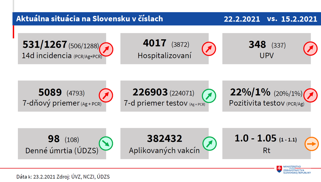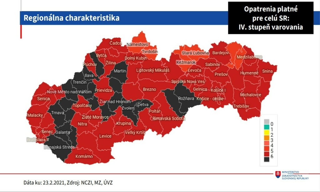Minister zdravotníctva Marek Krajčí (OĽANO) aj dnes (23.2.) aktualizoval zoznam okresov v jednotlivých stupňoch varovania COVID automatu. Celá krajina ostáva v IV. stupni varovania, teda v čiernej farbe. Počet hospitalizovaných pacientov dosiahol nový rekord.