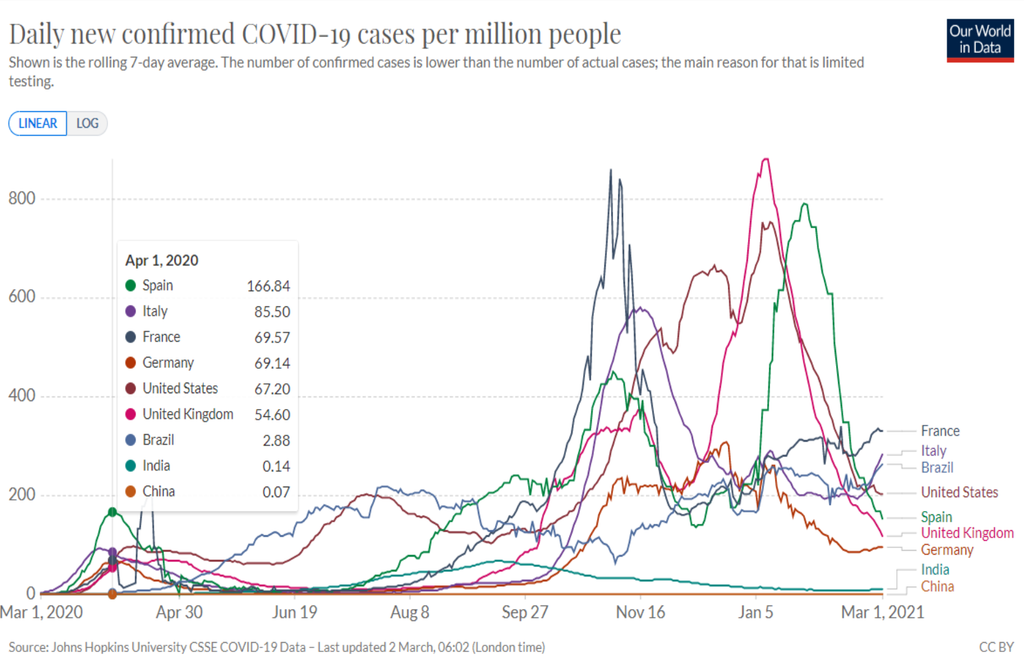 Koronavírus zasiahol ako prvú Čínu, tá sa však vďaka prísnym opatreniam a skúsenostiam z minulosti rýchlo spamätala. Horšie to bolo na jar 2020 v Európe a v Spojených štátoch amerických. V počte nových denných prípadov na tom boli najhoršie európske krajiny Španielsko, Taliansko, Francúzsko a Nemecko. Najvyšší denný prírastok malo Španielsko - až 10-tisíc nových prípadov. Vysoké čísla hlásila aj Veľká Británia a USA.