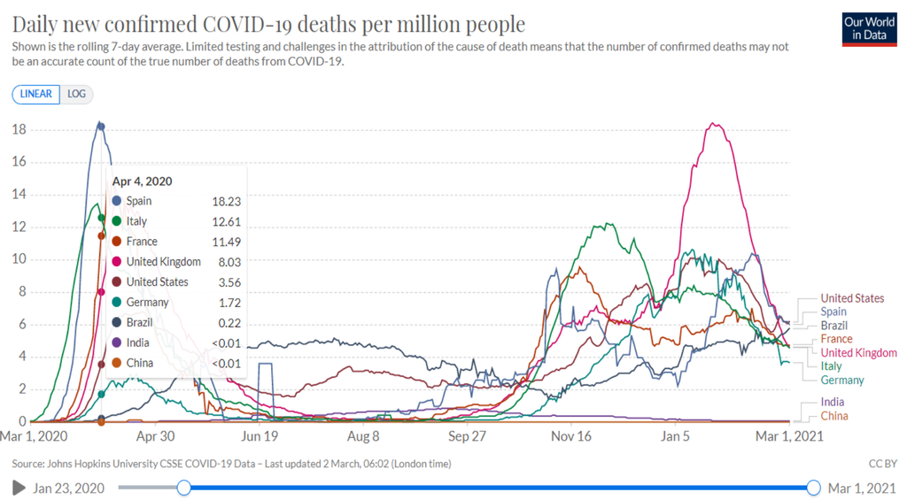 Veľká Británia bola na tom v januári 2021 najhoršie aj v počte nových úmrtí - až 1820 za deň. Za ňou nasledovalo Nemecko a USA. V týchto krajinách sa však začalo masívne očkovať voči novému koronavírusu a v súčasnosti patria medzi najúspešnejšie krajiny sveta vo vakcinácii, vďaka čomu sa situácia zlepšila.