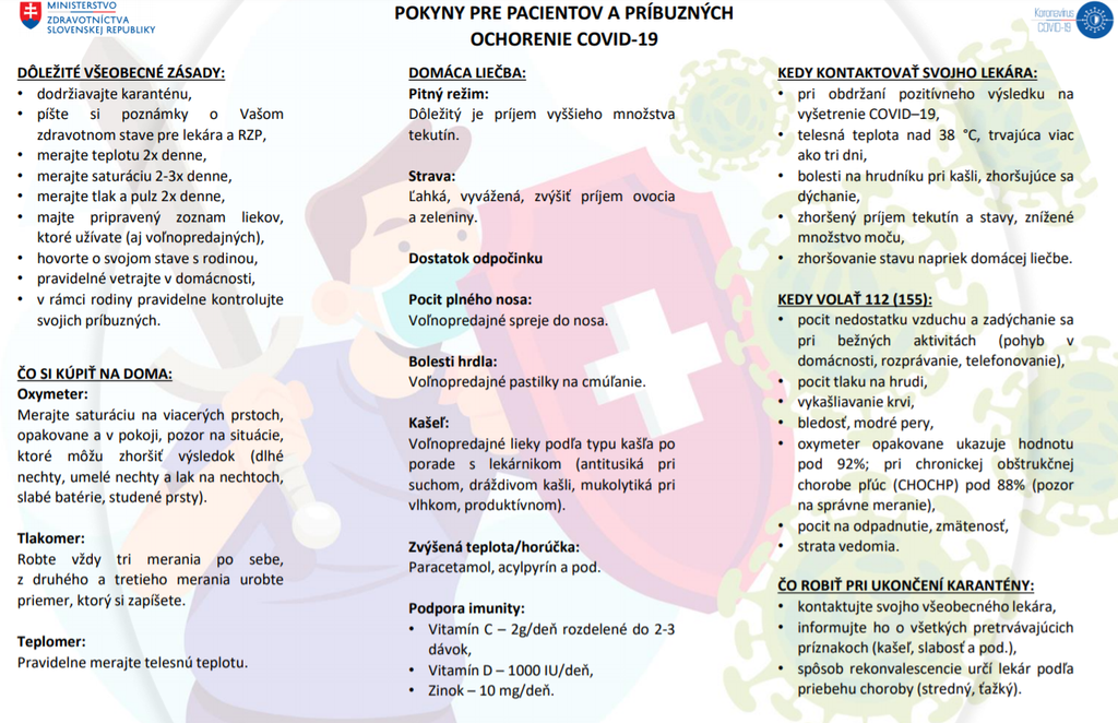 MZ SR pacientom s novým koronavírusom a ich príbuzným v domácom prostredí radí, aby boli vybavení pulzným oxymetrom a vedeli, ako ho používať. Ďalej by mali mať tlakomer či teplomer. Zároveň informuje o vhodných liekoch a tiež o tom, ako podporiť imunitný systém. Materiál tiež hovorí o tom, kedy je nutné kontaktovať svojho lekára a kedy záchrannú zdravotnú službu.