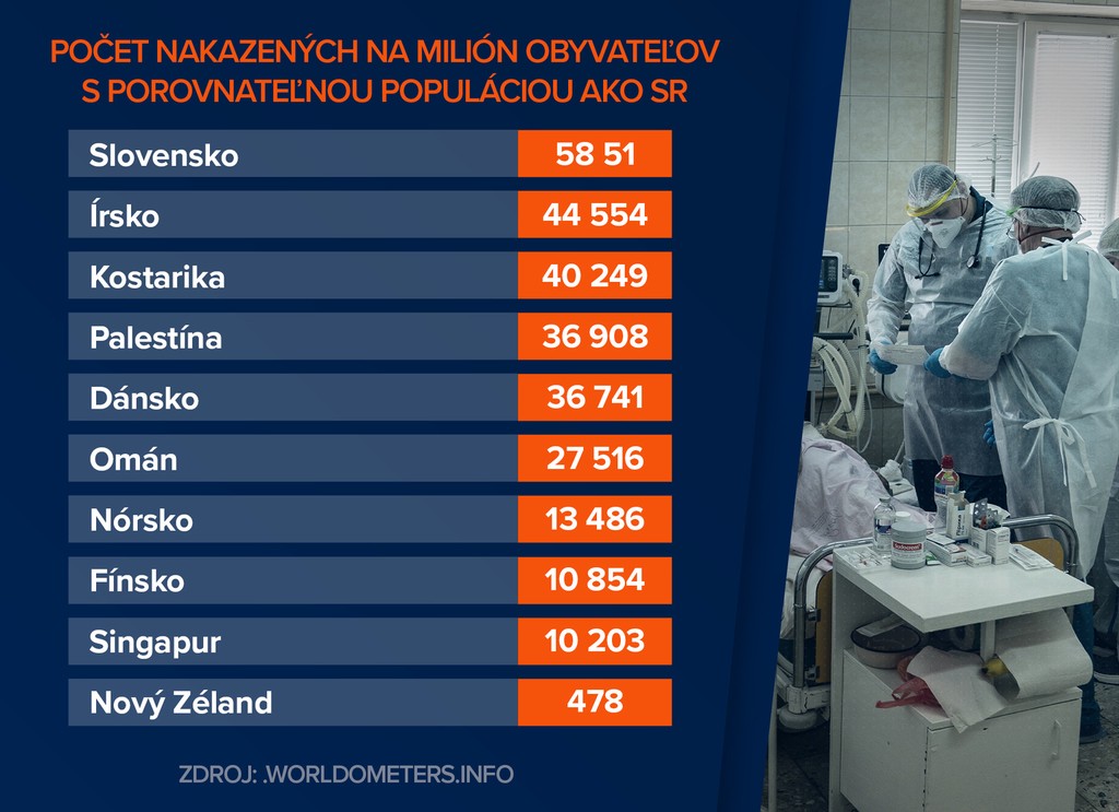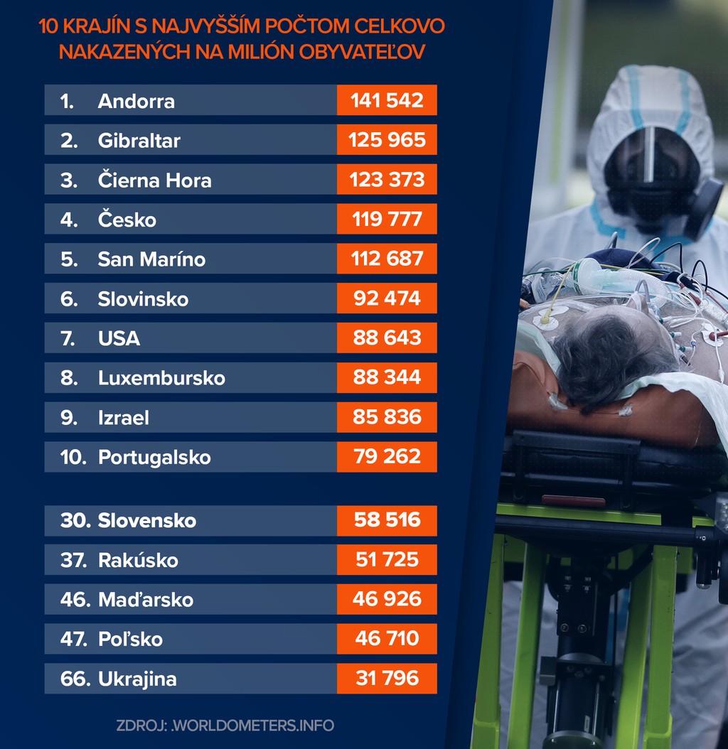 Slovensku, ktoré eviduje celkovo 319 582 prípadov nakazených koronavírusom momentálne patrí 30. miesto. Na milión obyvateľov tak pripadá 58 516 nakazených.