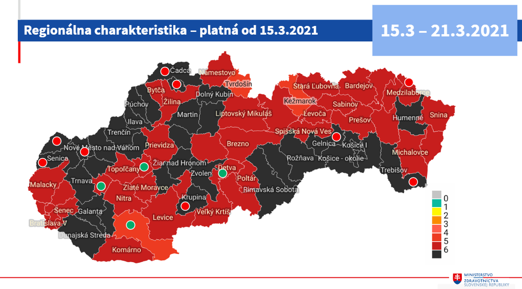 Pre celé Slovensko platí naďalej lockdown, ktorého súčasťou sú zatvorené nákupné centrá, bary, reštaurácie, fitness centrá a podobne. Ministerstvo zdravotníctva prehodnocuje situáciu každý utorok, keď prezentuje aktuálny stav. Aktuálne rozdelenie okresov bude platiť nasledujúcich sedem dní.