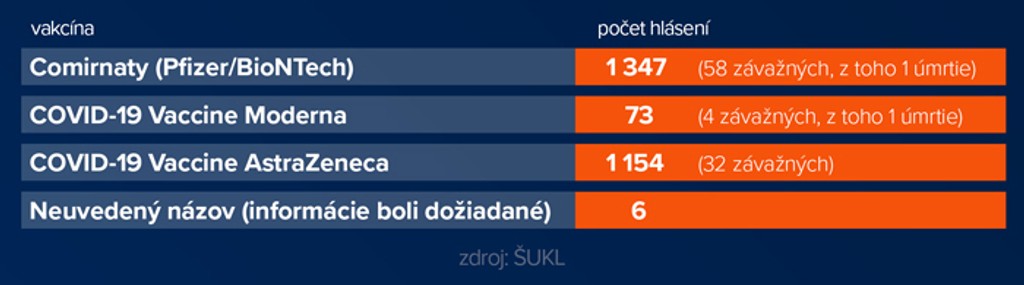 Ako ďalej informovala Jurkemíková v súvislosti s očkovaním na prevenciu ochorenia COVID-19 štátny ústav eviduje k strede (24. 3.) celkom 2 580 hlásení podozrení na nežiaduce účinky. K štvrtku (25. 3.) je z celkového počtu hlásení 94 závažných, čo predstavuje 3,6 percenta.