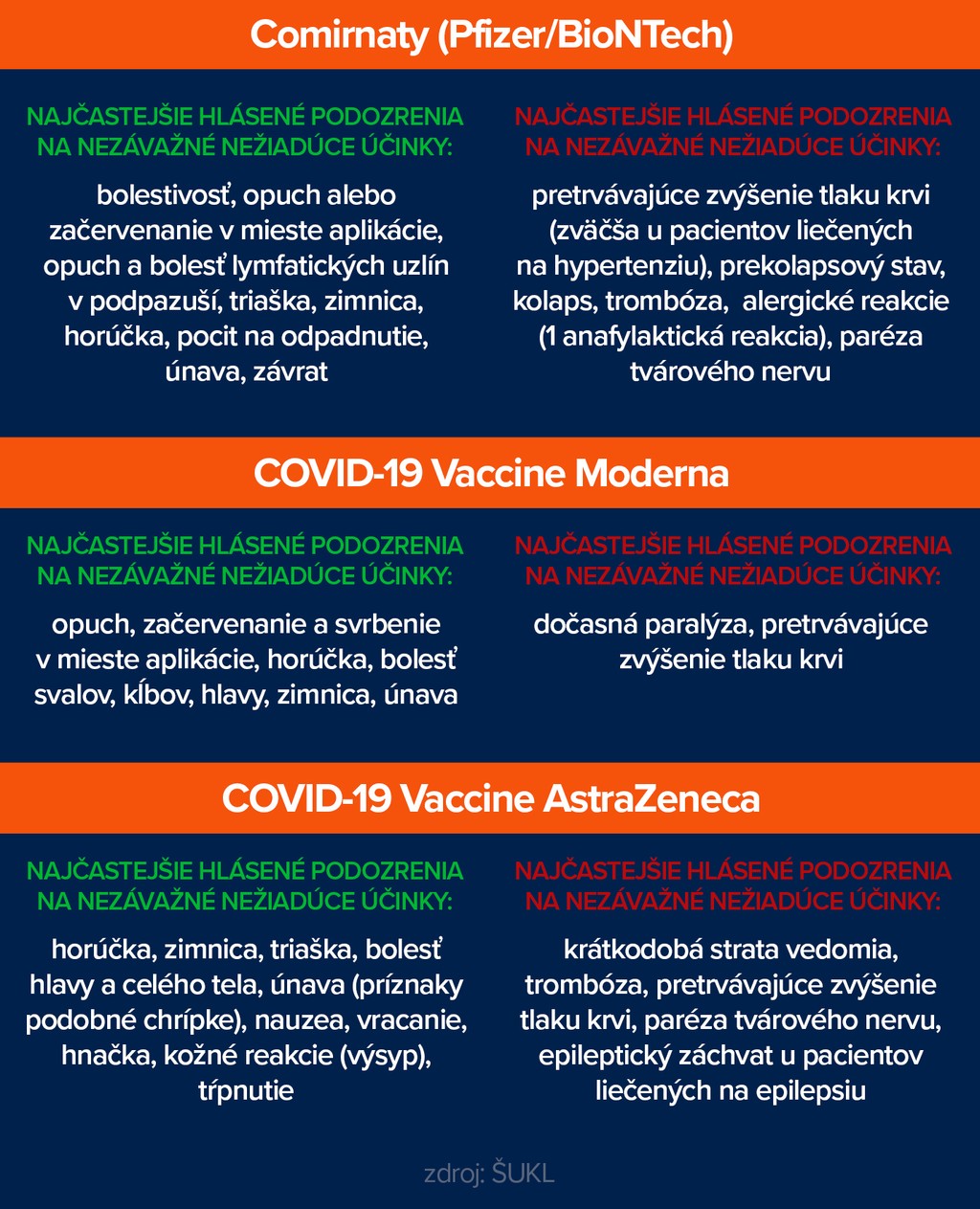 Podľa Jurkemíkovej všetky tri vakcíny spĺňajú prísne nároky na bezpečnosť a ani prijaté podozrenia na nežiaduce účinky ich bezpečnosť nespochybňujú. Dokumenty k registrovaným vakcínam a informácie o tom, ako nahlásiť podozrenia na nežiaduce účinky, nájdete tu. Hlásenia sa po ich prijatí spracúvajú podľa štandardných farmakovigilančných postupov, podrobnosti nájdete na webe ústavu.