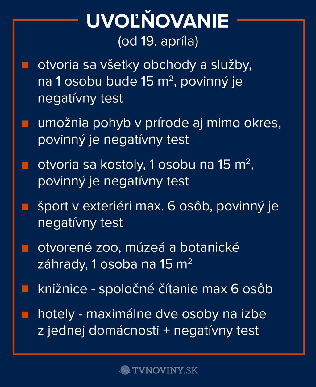 Otvoria sa aj všetky obchody a služby pod podmienkou dodržania 15 metrov štvorcových na jednu osobu. Povinným bude negatívny test na COVID-19. Umožní sa tiež pohyb v prírode mimo okres, rovnako pod podmienkou negatívneho testu.