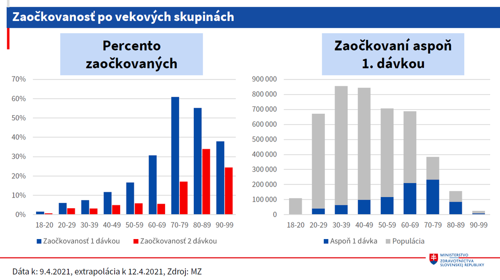 Medzi 4. a 11. aprílom prijali slovenské nemocnice 1 318 pacientov. Z nich tretina boli ľudia od 61 do 70 rokov a zhodne po 21 percent boli ľudia zo skupín od 51 do 60 a 71 až 80 rokov. Tieto skupiny obyvateľstva mali byť už v priebehu marca zaočkované.