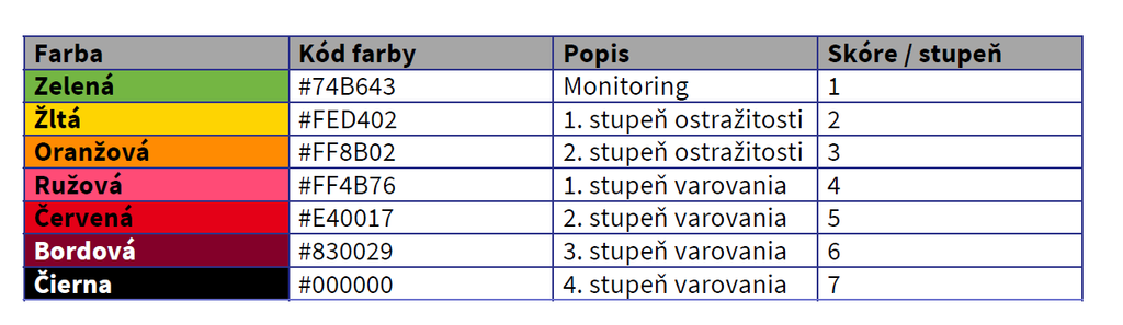 1. stupni varovania (ružová): interiér do 25 osôb, exteriér do 50 osôb